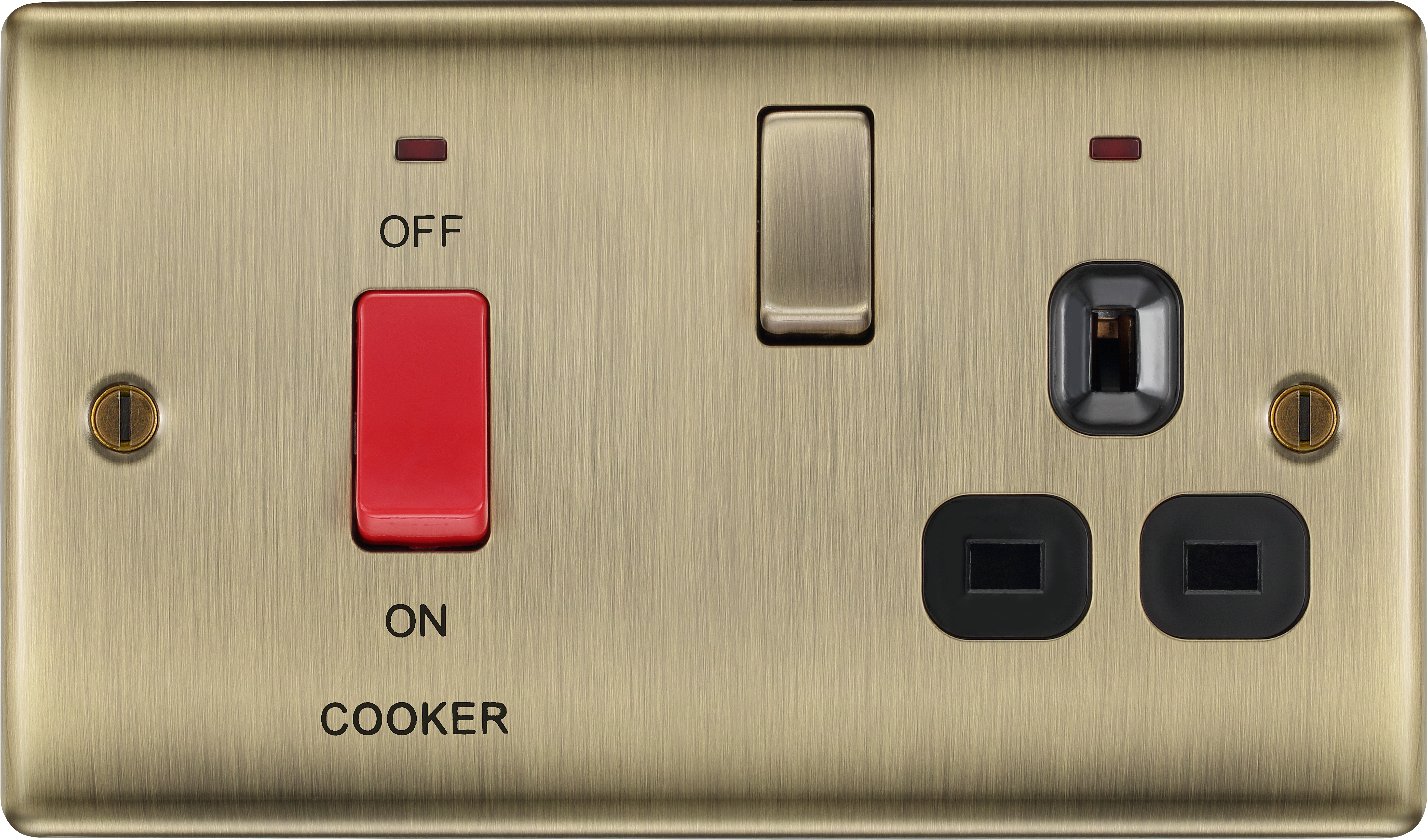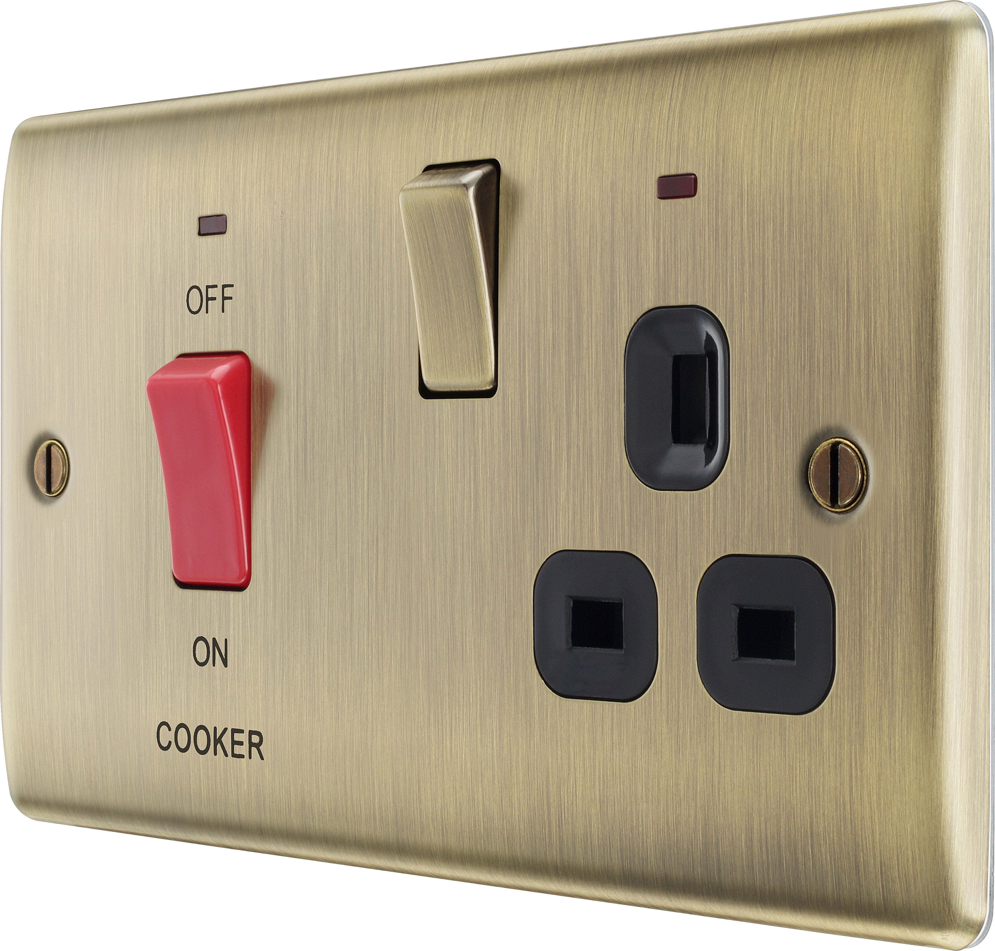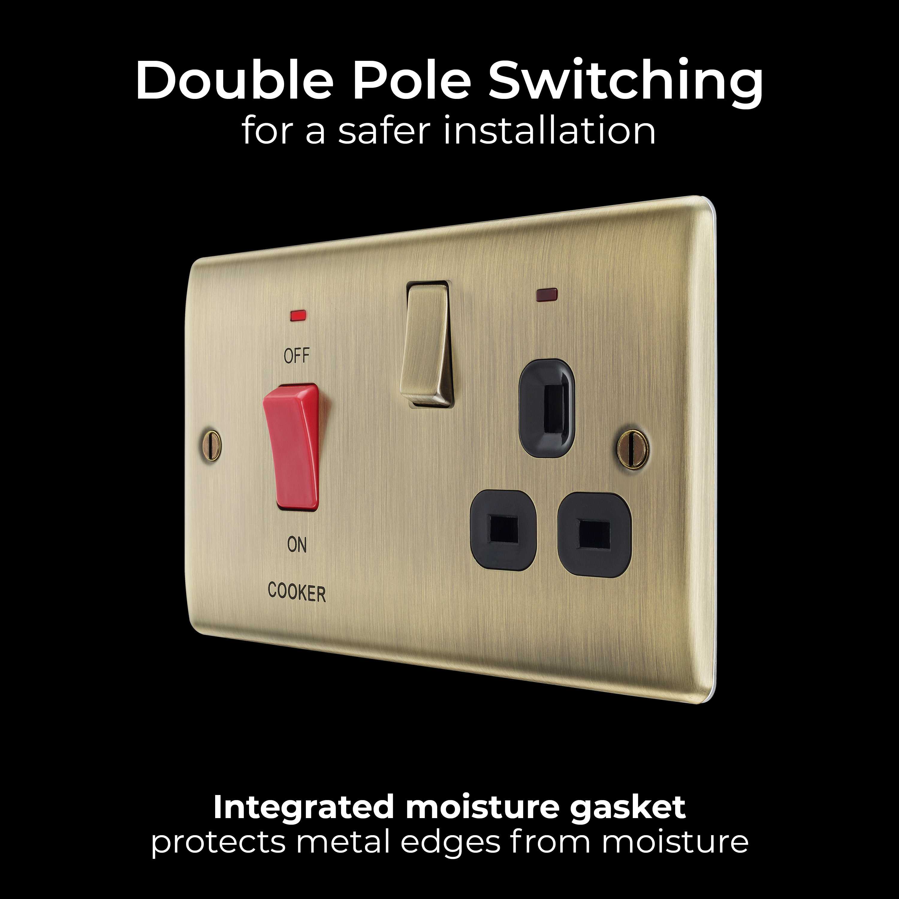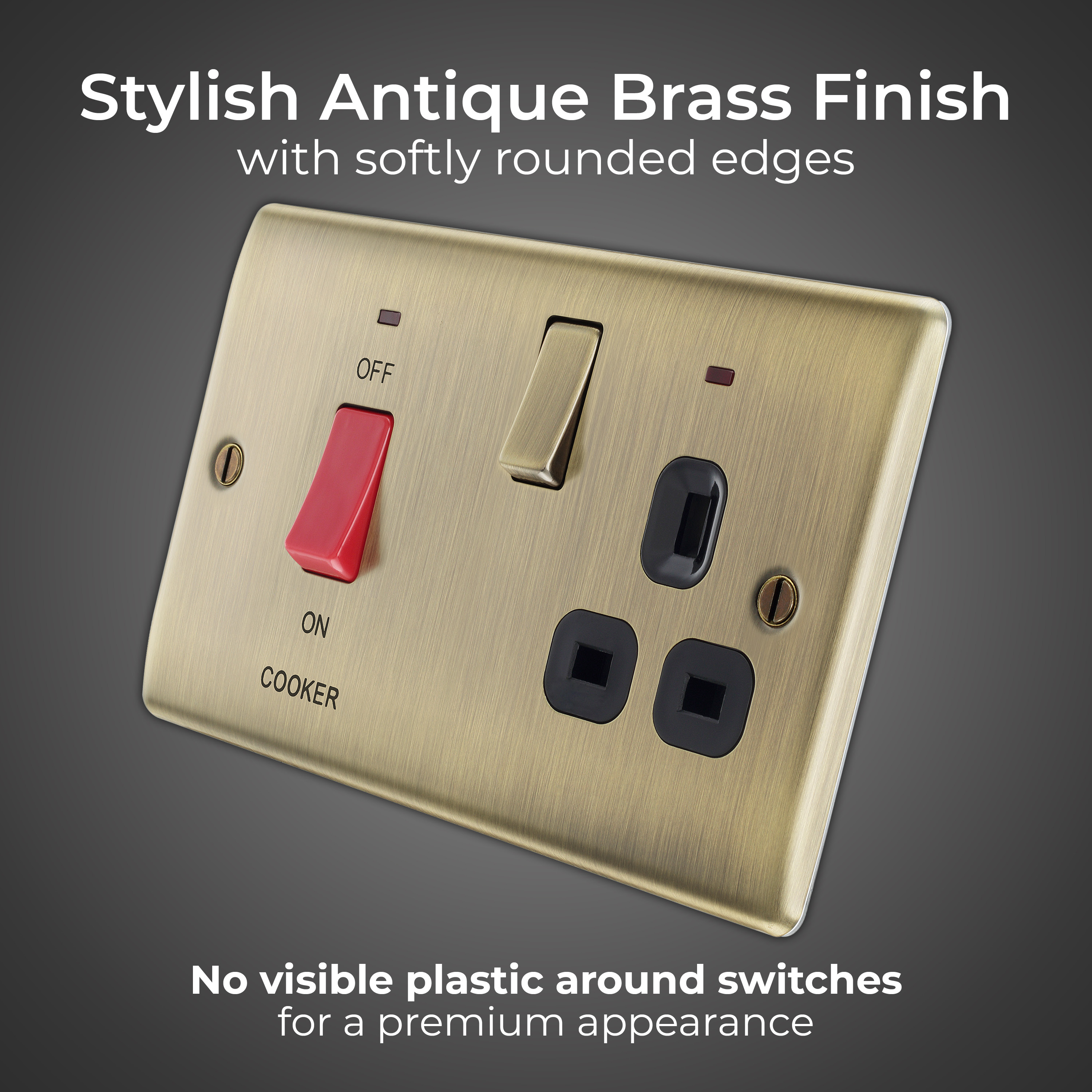BG Nexus Metal, Antique Brass, 45A Cooker Control Unit With 13A Socket And LED Indicators, Black Inserts